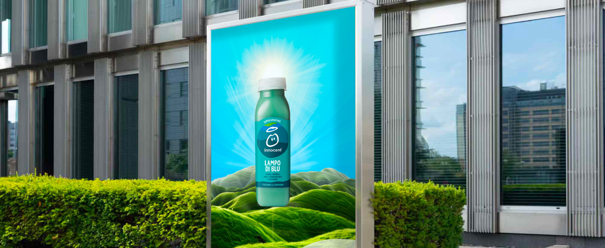 Ho ideato una pubblicità per Innocent in cui la bevanda è ambientata in uno spazio verde e luminoso, per trasmettere naturalità e freschezza.